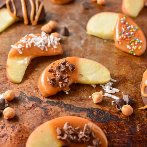 Store slices in an airtight container in the fridge for up to 3 days; place parchment between layers to prevent sticking. Freeze plain apple slices (without caramel) for up to 1 month; thaw and dip fresh. Prep apples and caramel a day ahead; store caramel in the fridge and reheat gently. Dip and decorate fresh for the best texture. Add toppings just before serving.