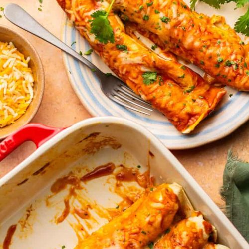 Store baked enchiladas in an airtight container in the fridge for up to 3 days; reheat in oven at 350°F for 15 minutes. Freeze unbaked rolls for up to 2 months; bake from frozen, adding 10 minutes. Prep filling a day ahead; store in fridge. Reheat with extra sauce for moisture. Add garnishes before serving.