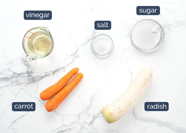 Substitutions: Use apple cider vinegar instead of rice vinegar for a different tang. Swap sugar with honey or agave for a natural sweetener. Replace daikon with regular radishes for a similar crunch. Use cucumber instead of carrots for a variation.